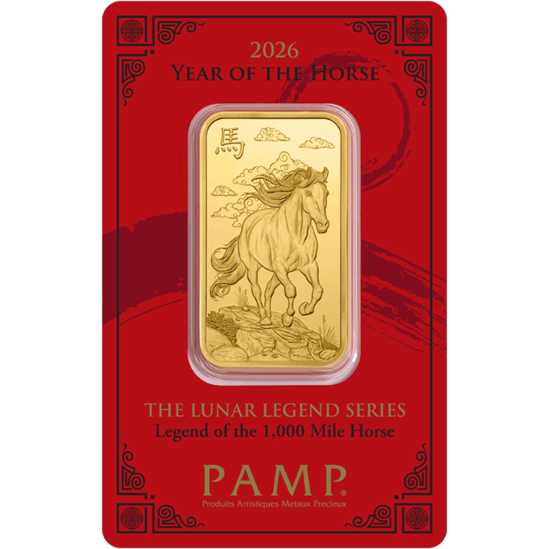 The Lunar Legends series tells the stories related to each of the 12 animals of the Chinese Zodiac. 2026 is the Year of the Horse – the 1,000 Mile Horse is a mythical creature of classic Chinese folklore, able to travel one thousand li, or approximately one third of a mile, in a single day. This amazing horse was too swift to be mounted by anyone but Bo Le, a famed expert. The 1,000 Mile Horse is captured in 1 oz of pure gold! A symbol of perseverance and mythical might, it’s a striking addition to any collector’s stable. Housed in a vibrant CertiPAMP assay card accompanied by a gift sleeve, each bar is individually serialized. Third issue in the Lunar Legends series.